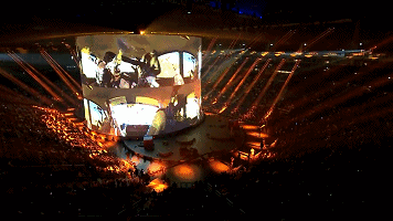 舞台中心有个巨大的360°圆柱纱幕,《绝地求生》的场景不断的在投影幕墙中变换。当投影出现一架飞机时,全副武装的特技演员可以从天而将,他们在枪声不断、烟雾四起的场景中匍匐前进,手持的假枪枪口部位还设计了烟火特效,配合着现场破旧的汽车、飘烟的空投和残垣断壁的布景,真实演绎了游戏中交火的激烈场景。